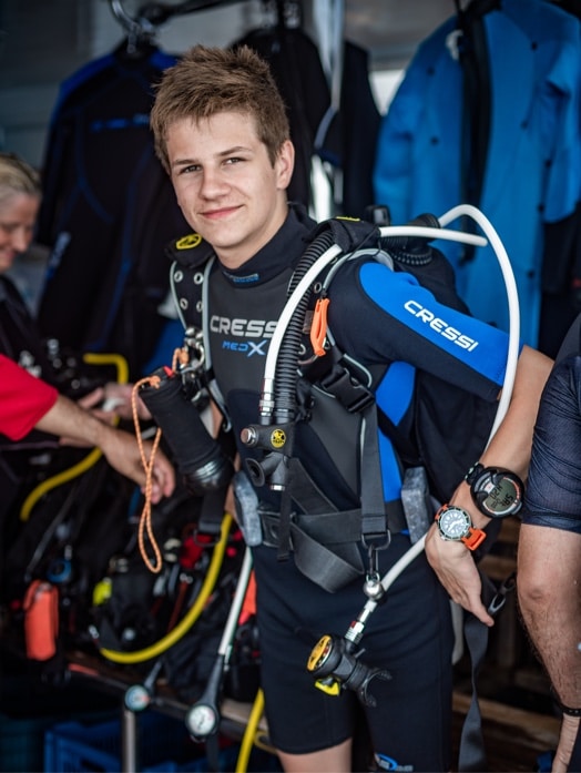 Plongeurs : 10 plongées environ soit une le matin et une en fin de journée. Entre les 2, de larges intervalles pour profiter des dauphins. Non plongeurs : venez snorkeller et nous vous offrons votre baptême de plongée. Si vous le souhaitez, cette croisière est la seule dont les sites vous permettent de passer votre premier niveau PADI OPEN WATER (en supplément).